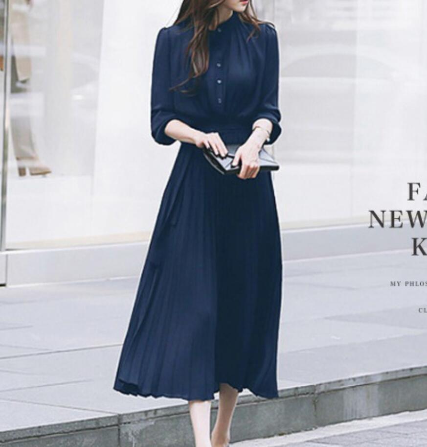 - 人気新品*長袖 ワンピース プリーツ プリーツワンピース 春 秋 マキシ ロングワンピース きれいめ ウエストリボン付き シフォン*ネイビー