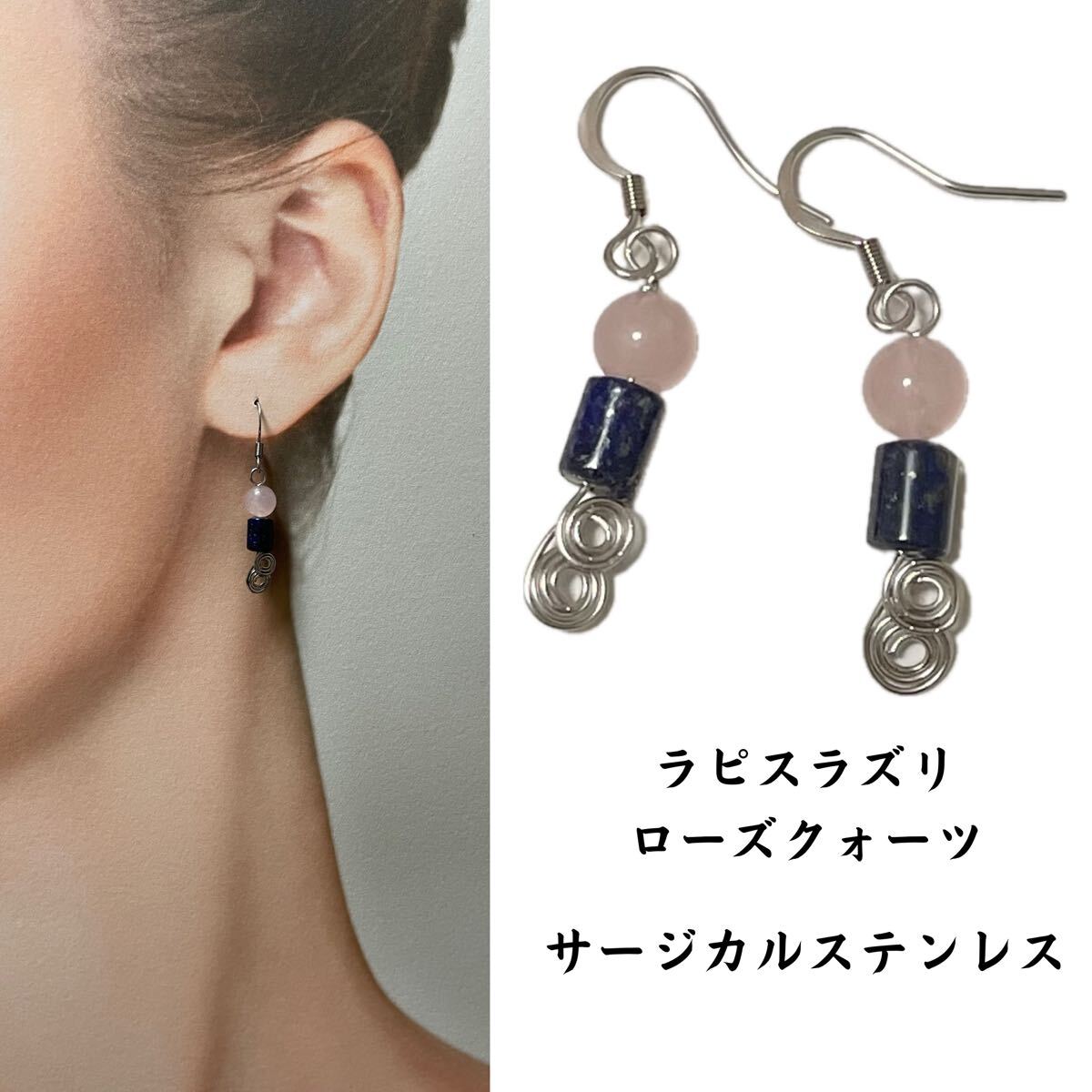 - W41. 天然石 ピアス ラピスラズリ ローズクォーツ サージカルステンレス アレルギーフリー ニッケルフリー ハンドメイド