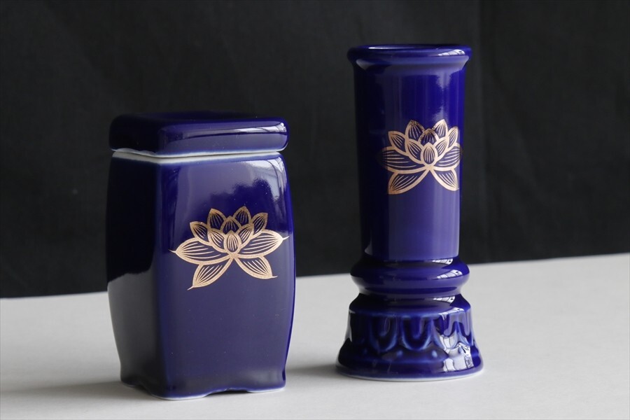 - 国産 瑠璃 ルリ 金蓮 ■ 四角マッチ消 線香差 ■仏具■陶器 2点セット モダン・ミニ仏檀に■ お盆 お彼岸 お墓参り 供養