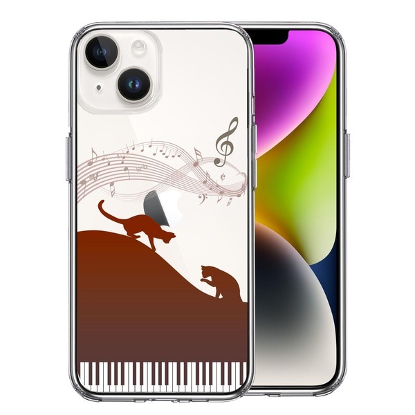 > iPhone14Plus ケース クリア ピアノ シルエット猫 ブラウン スマホケース 側面ソフト 背面ハード ハイブリッド