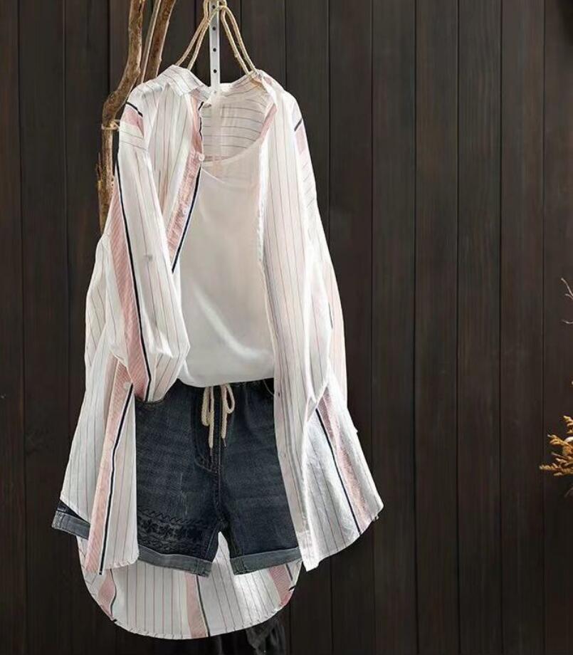 > 新品*シャツ チュニック コットン プリント柄 ゆる レディース ロングシャツ 薄い 長袖 ブラウス オフィス カジュアル風*ピンク