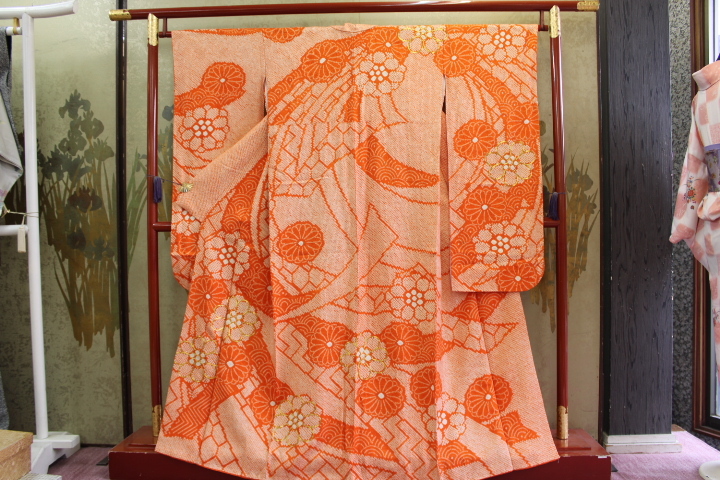 - きもの今昔6787 ふりそで 正絹紗綾型綸子地 総絞り大熨斗柄に梅の大輪 金駒刺繍入り 身丈160cm