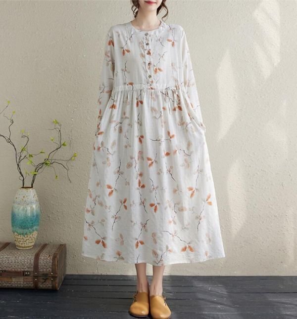 - LB153 ロングワンピース レディース きれいめ カジュアル ゆったり 大きいサイズ 綿麻 小花柄 着痩せ 大人 ワンピース ベージュ