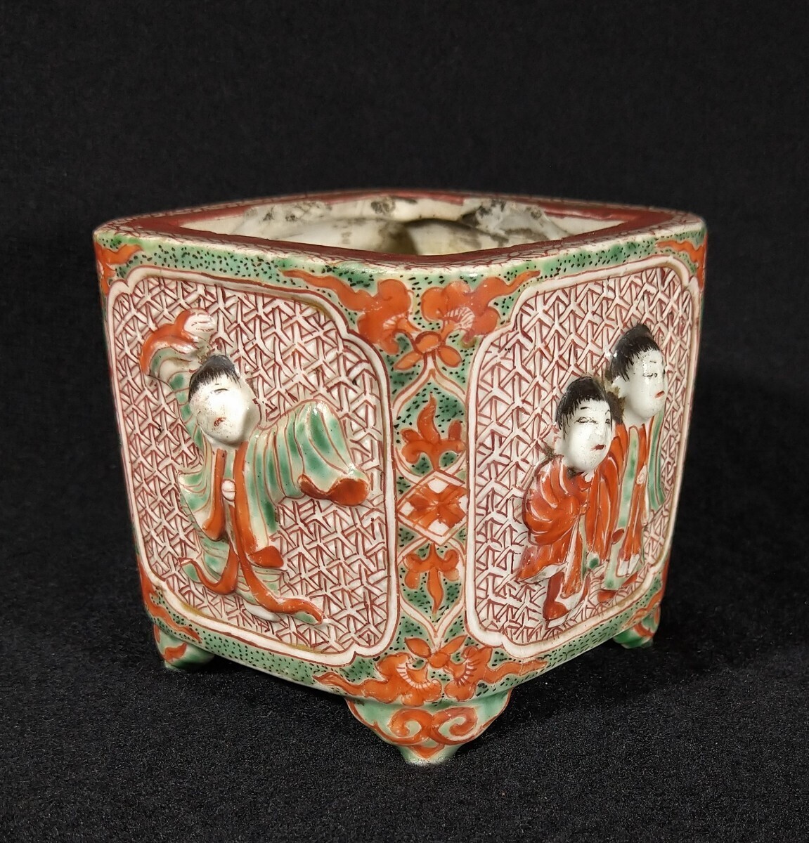 - 古い中国 清朝 色絵 盛絵 四足 賢人図 8cm 香炉 火入 中国美術 b-24f3550