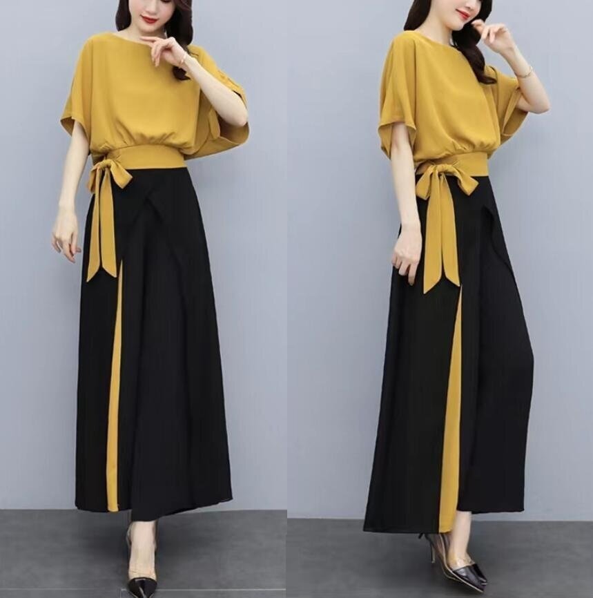 > LC190 レディース上下パンツ スーツ Aライン オシャレ シフォン ドレス オフィス セットアップ 大人 黄/Lサイズ