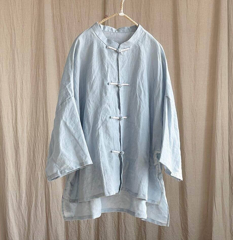 > LB968 春 レディース チュニック シャツ シンプル ゆったり 綿麻 長袖 シャツチュニック 春秋 大人 ブルー/Lサイズ