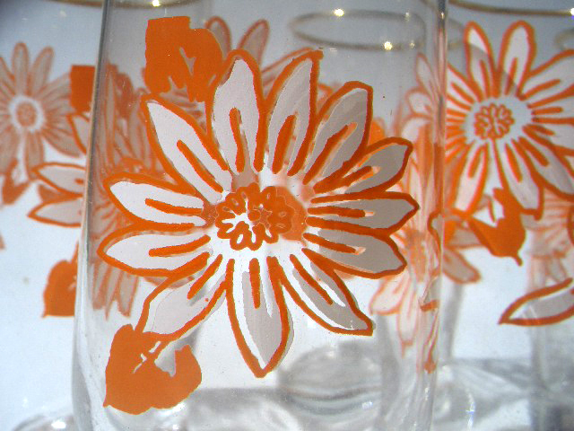 > ♪60S 70S 昭和レトロポップ サイケディリック 蜜柑色 咲き乱れるガーベラ 神秘 花柄 愉快に楽しくゴクゴク^^。しましょ♪橙色美人5人姉妹