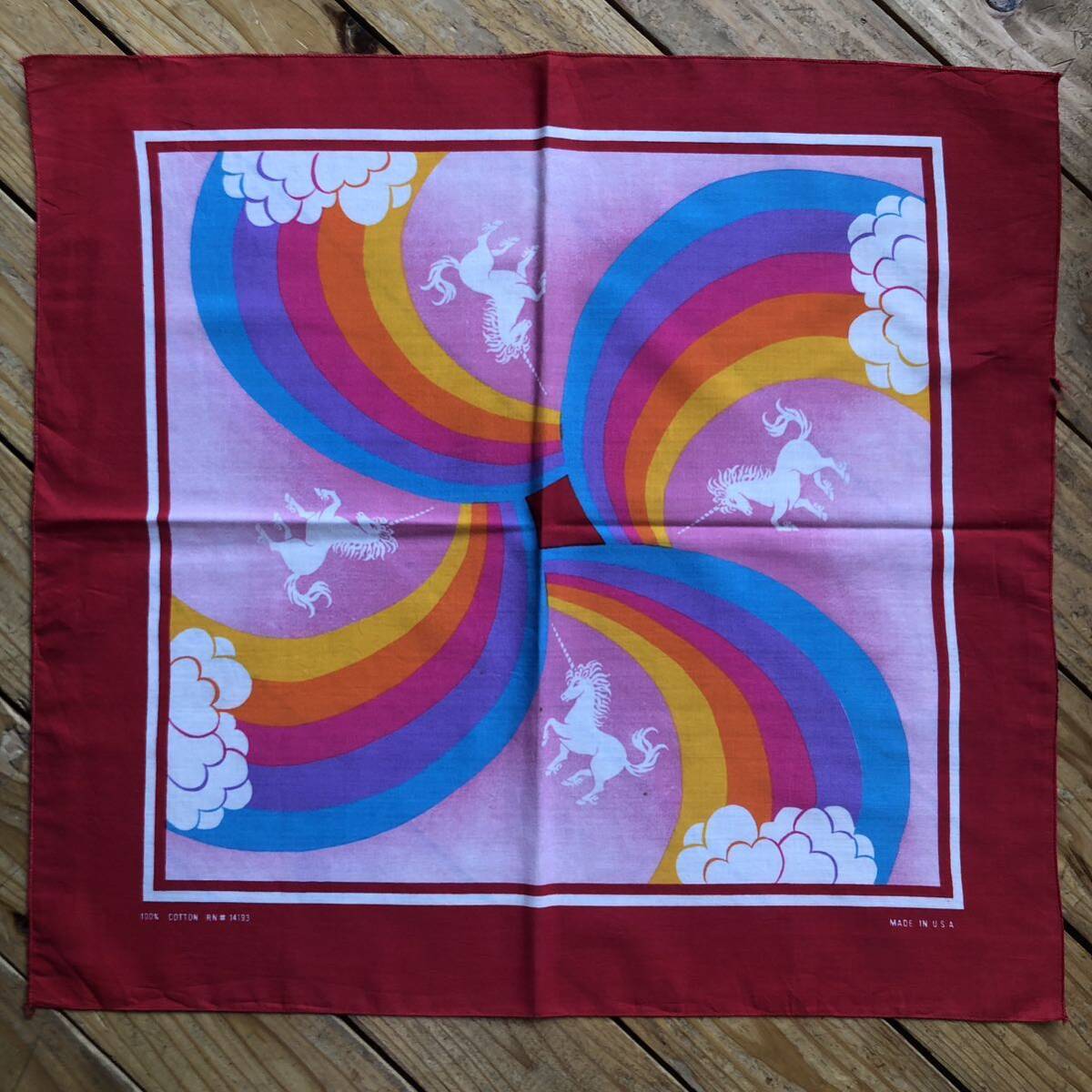 > 送料無料 Vintage バンダナ ユニコーン Made in USA カラフル 虹 レインボー レッド ハンカチ アメリカ仕入 雑貨 ヴィンテージ A0977