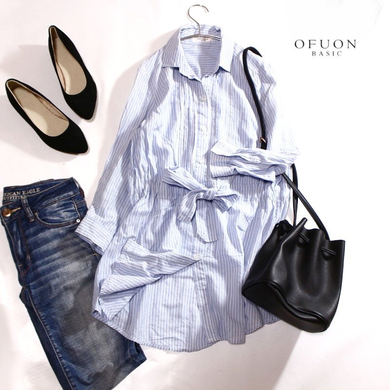 > 美品 オフオン ベーシック OFUON basic イトキン(株 春 夏 ベルト入り 七分袖 ~ 半袖 ストライプ柄 ロングシャツ 9号 38 水色 ホワイト 白