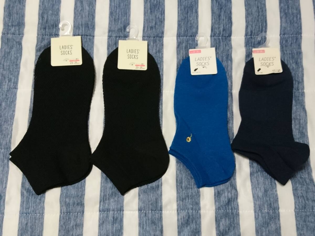 > 4足セット レディース スニーカー丈 ソックス 23~24cm 黒 クロ ブラック & ショート丈 花刺繍 ブルー & スニーカーイン 紺 フットカバー