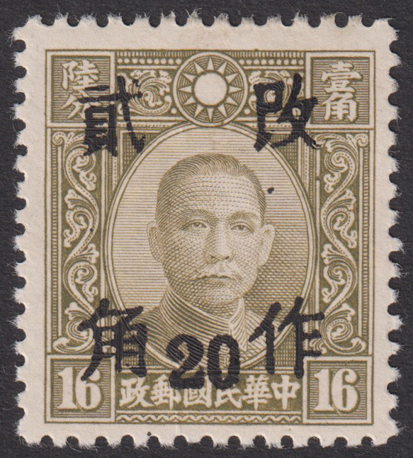 - 旧中国切手 1943年2月 改作二角(20分)票 湖南 黒加刷 中華版孫文 16分 未使用 JPS:709a Chan:697 1423