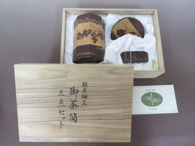 - 未使用品「桜皮細工 御茶筒三点セット」木地:本けやき 八角茶筒 ぶどう くさ忠 伝統工芸 送料無料!
