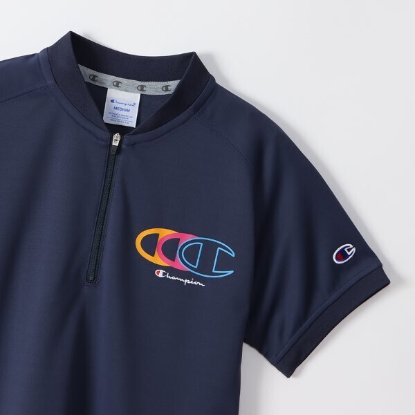 - 新品♪(チャンピオンゴルフ)Champion-Golf♪ ロゴデザイン ストレッチ 半袖 ハーフジップシャツ ネイビー♪Mサイズ♪
