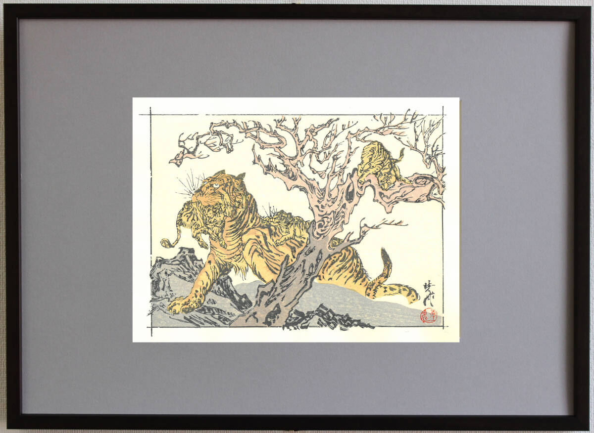 > 真作保証 額装 河鍋暁斎 木版画 虎 没後120年記念 木版摺「暁斎楽画」初版 明治14年より! 京都の名摺師が手掛けた最高作品!!