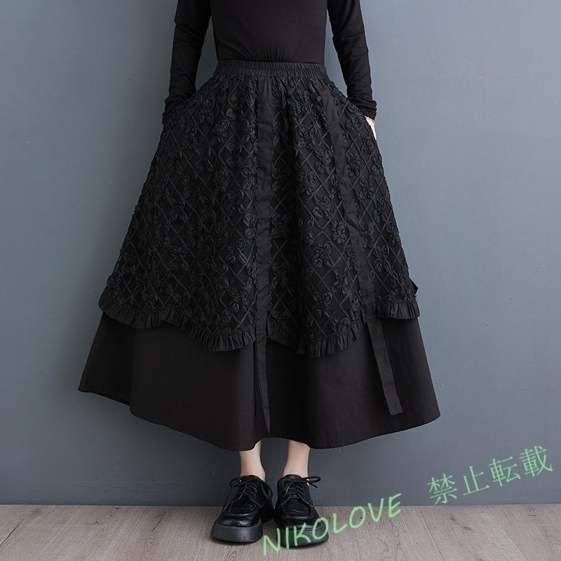 - 新品レディース カジュアル 切り替え 総柄 ギャザー ゆったり大きいサイズロングフレアスカート LE442