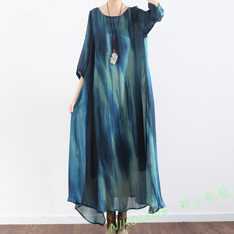- 新品カジュアル ファッション 大きいサイズ 丸首 絞り染めのグラデーション ひらひら雲の紗 七分袖 ワンピース LE439