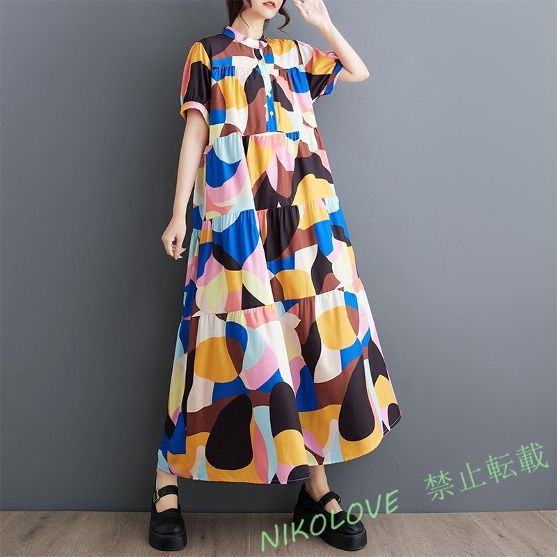 - 新品レディース エレガント 切り替え ゆったり大きいサイズ体型カバー 半袖ロングワンピース 不規則な円形 LH491