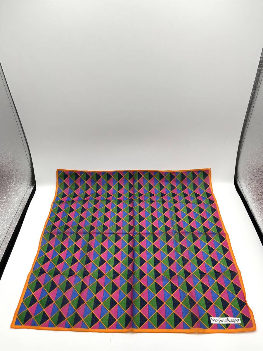 - yves saint laurent イヴサンローラン ハンカチ バンダナ オレンジ×ピンク×ブルー×グリーン ダイヤチェック柄 シンメトリー W48 H48