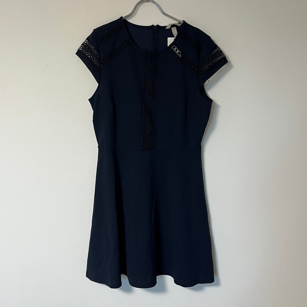 - H&M エイチアンドエム 新品タグ付き 半袖ワンピース レース ひざ丈 背面ファスナー ドレス ネイビーサイズM