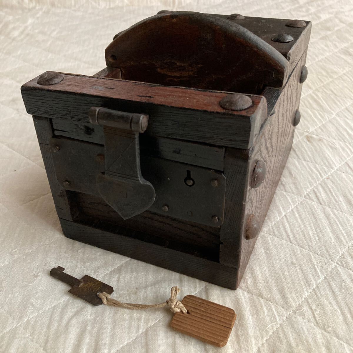 - 江戸.幕末.明治時代.珍品.小型.総欅.木製 .銭箱 .小物入れ .古道具 .鍵付き.完品.稼働品.横幅.約14.5cm .奥行き.約20cm.高さ.約15cmです。