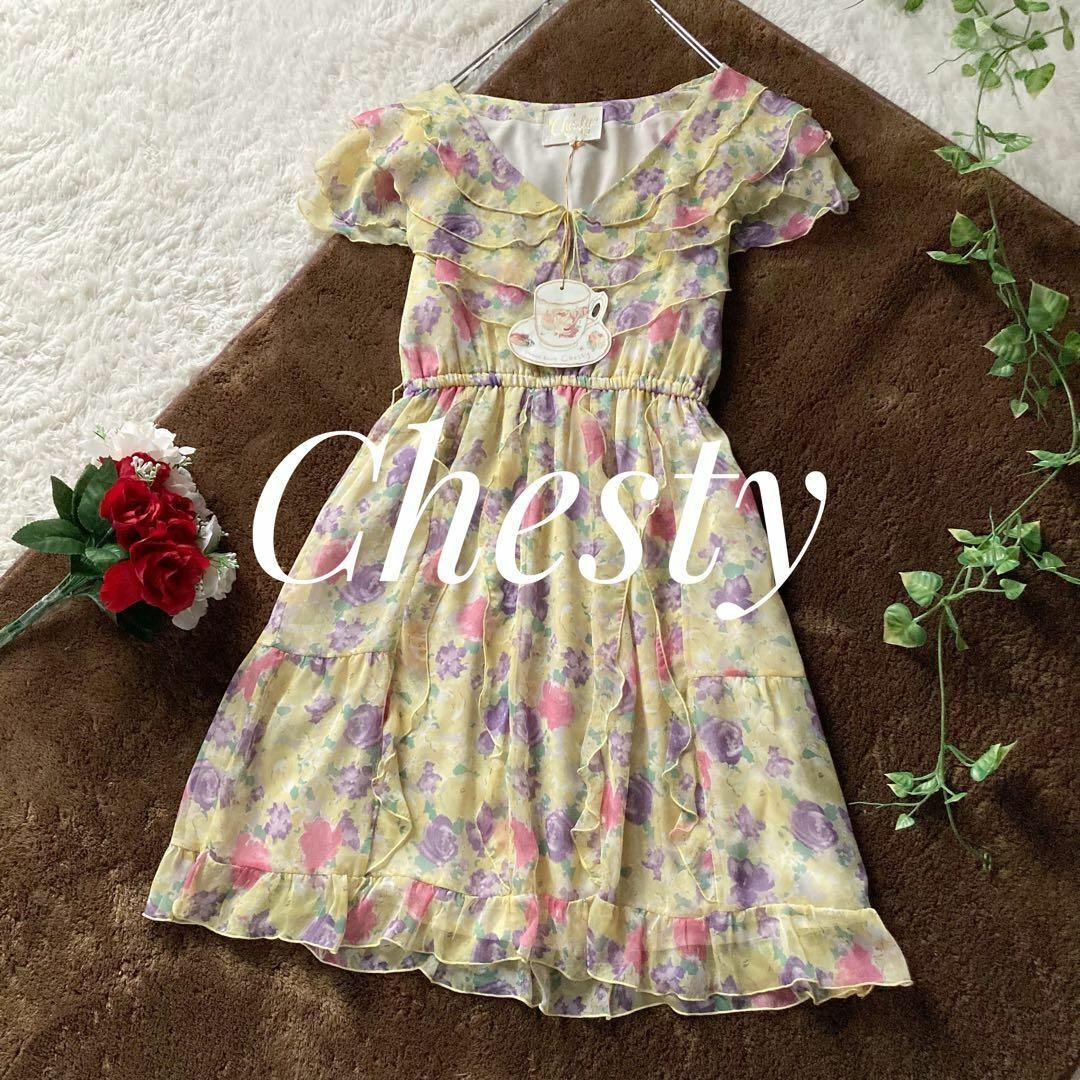 - タグ付き チェスティ シフォンフレアワンピース 花柄 フリル 春夏 0サイズ イエロー Chesty