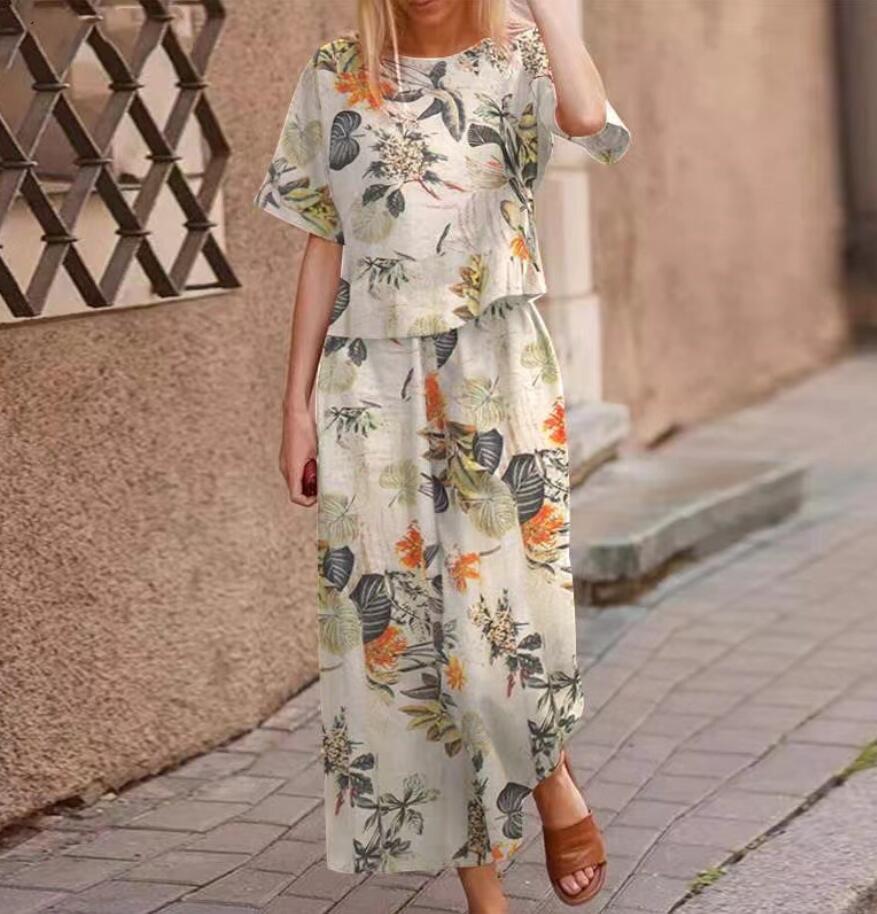 - M-3XLサイズ選ぶ / レディース上下パンツ プリント柄 セットアップ 大きいサイズ 半袖 ブラウス ワイドパンツ 2点セット 大人 / 花柄1