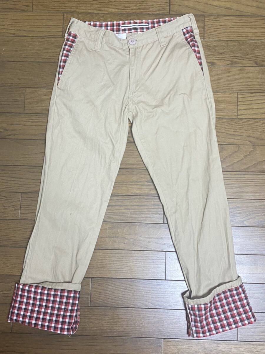 > ★ チノパン 裾裏チェック柄 ウエスト38cm 股下73cm ロールアップ チノパンツ ボトムス パンツ ベージュ メンズ 赤チェック