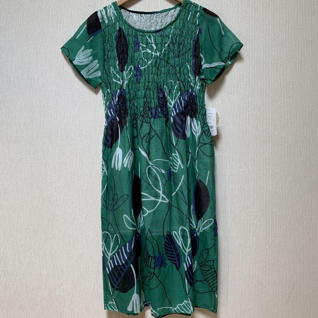- 新品未使用 ワンピースドレス 綿100% 天然素材 裏地有り 着丈105㎝ グリーン M~Lサイズ