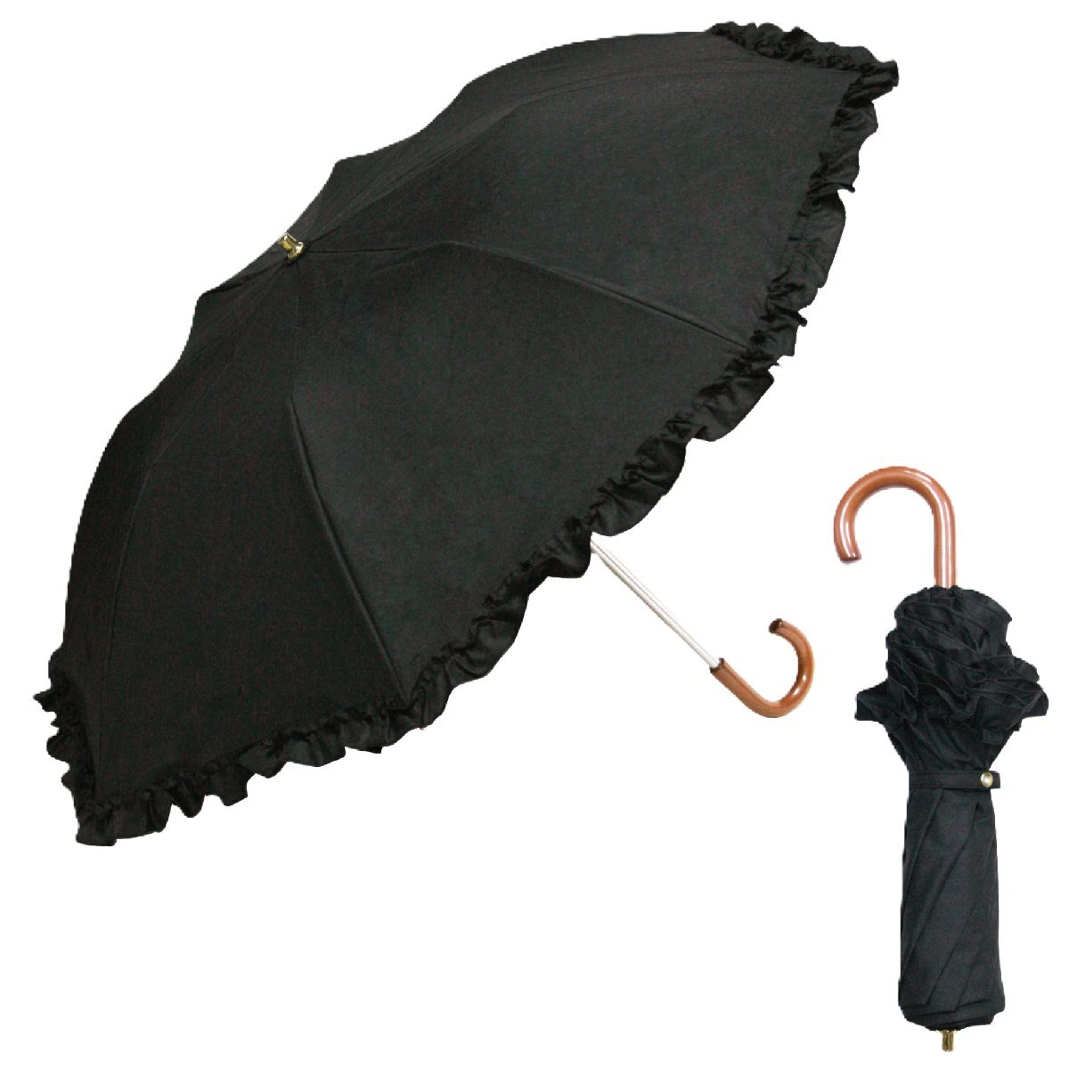 - フリルがおしゃれな 美しいシルエット 折りたたみ傘 UVカット 防水加工 晴雨兼用 親骨50cm ブラック 自然に開閉 らくらく サッとたためる