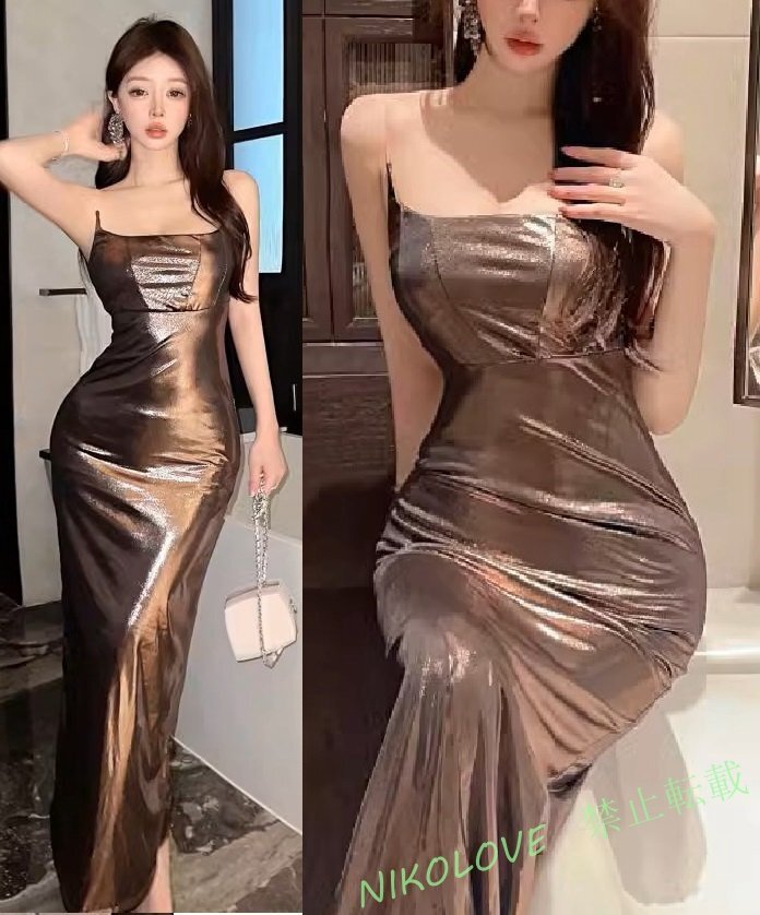 > ☆新品*セクシー**良質*とろみ素材*キャミソール*スリット*入*ロング*ワンピース*メタリック*金*ゴールド*LF620