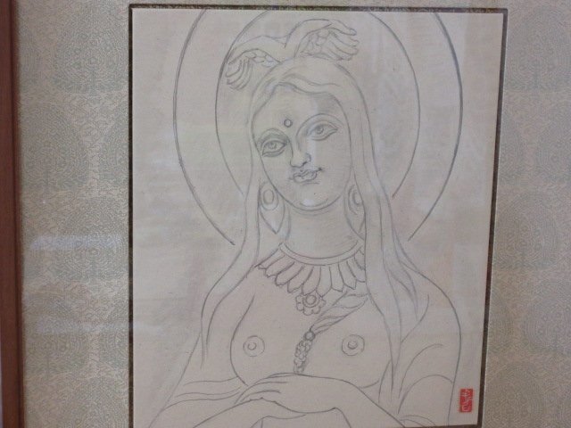 - 真作 杉本哲郎「鳩の女神」肉筆 額装 杉本一郎 鑑定シール付き 仏画 仏教美術 画寸 約28cm×24cm 送料無料!