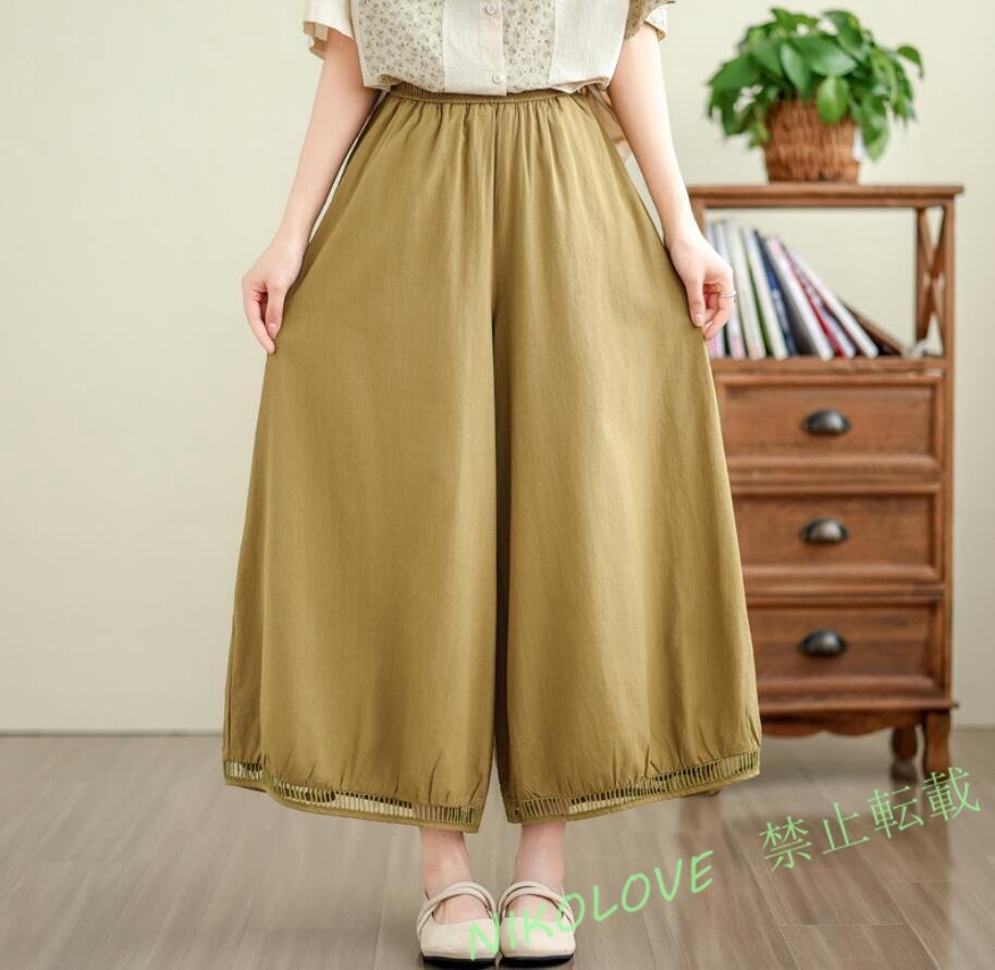 - 新品 夏ガウチョパンツ レディース ボトムス ワイドパンツ パンツ ロング丈 ウエストゴム ゆったり 大きいサイズ パンツカーキ XL LG809
