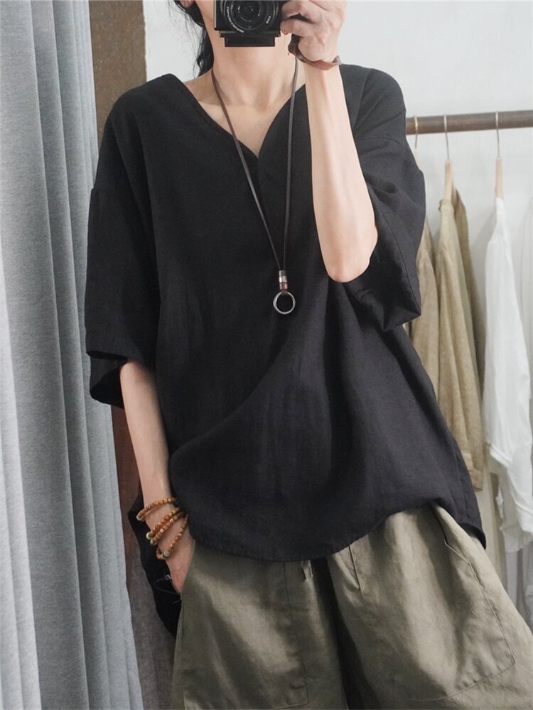 - 夏新品* カジュアル トップス 無地 大人 上品 キレイめ チュニック 薄手 リネン ブラウス Vネック 着痩せ 半袖 チュニック *ブラック