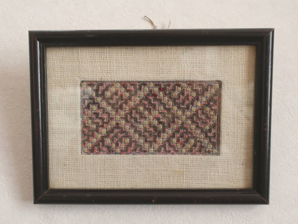 > モン族刺繍 額装 茶xピンクxクリーム色 木枠 20.5x15x1.7cm