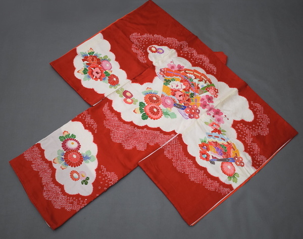 > A32-7【凛々】即決 中古品 正絹 お宮参り 女児 初着 祝着 赤 扇子 花 長襦袢付