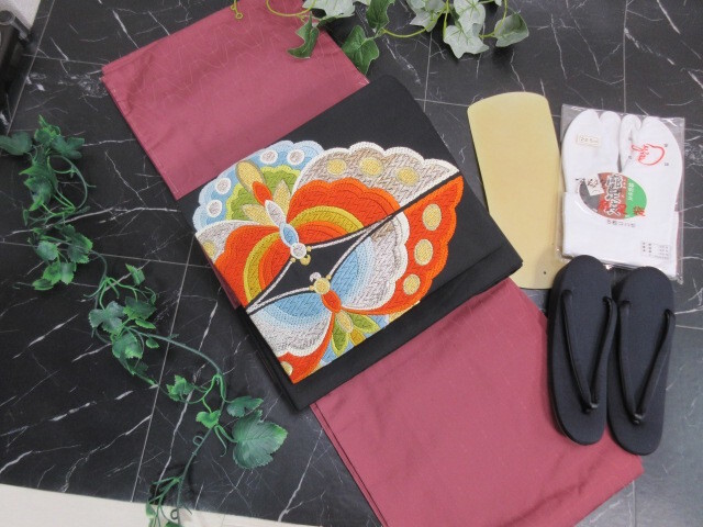 - 【OH3569/8】和装 無地(絹)・小物 全5点まとめてセット 帯・足袋・草履・帯板 仕付け糸付き