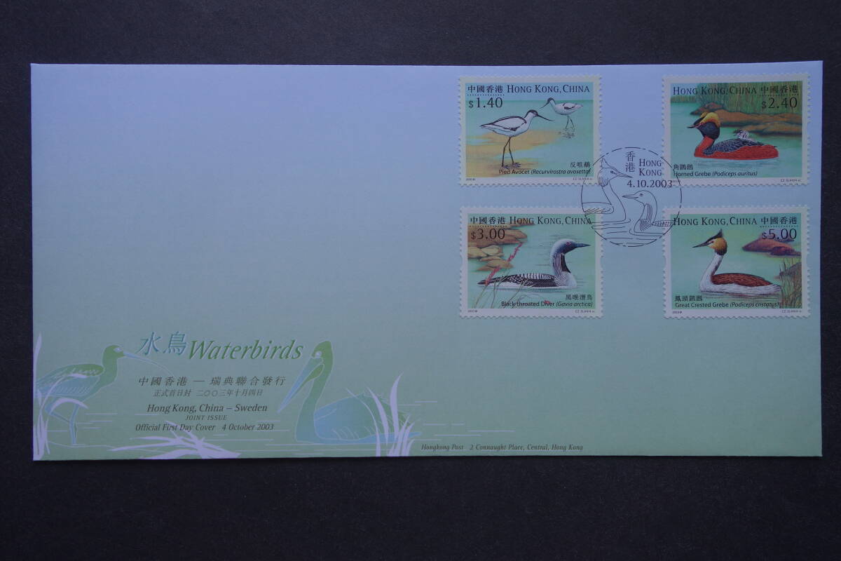 - 外国切手: 中国香港切手「(スウェーデンとの共同発行)水鳥」4種完 貼り FDC(初日カバー)