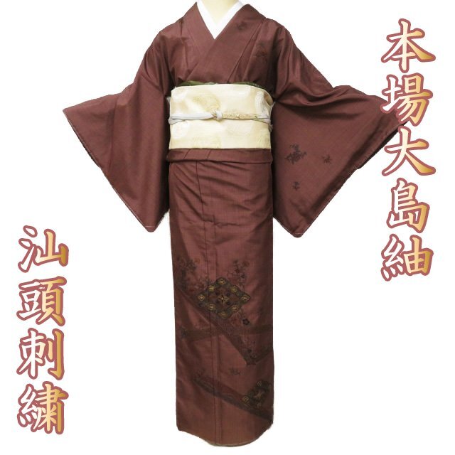 > 大島紬 着物 中古 袷 セミフォーマル ラベル付き 汕頭刺繍 スワトウ 花模様 茶色 多色 身丈163cm 裄64cm L きもの北條 A1059-10