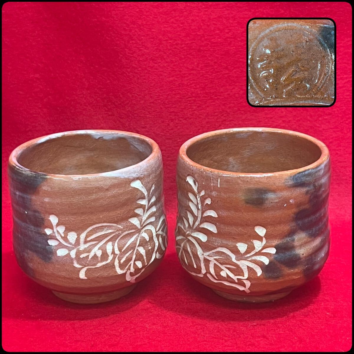 > 楽焼 赤楽 湯呑 茶碗 2客 陶印 在印 茶道具 茶器 白釉 彫り模様 (07166並