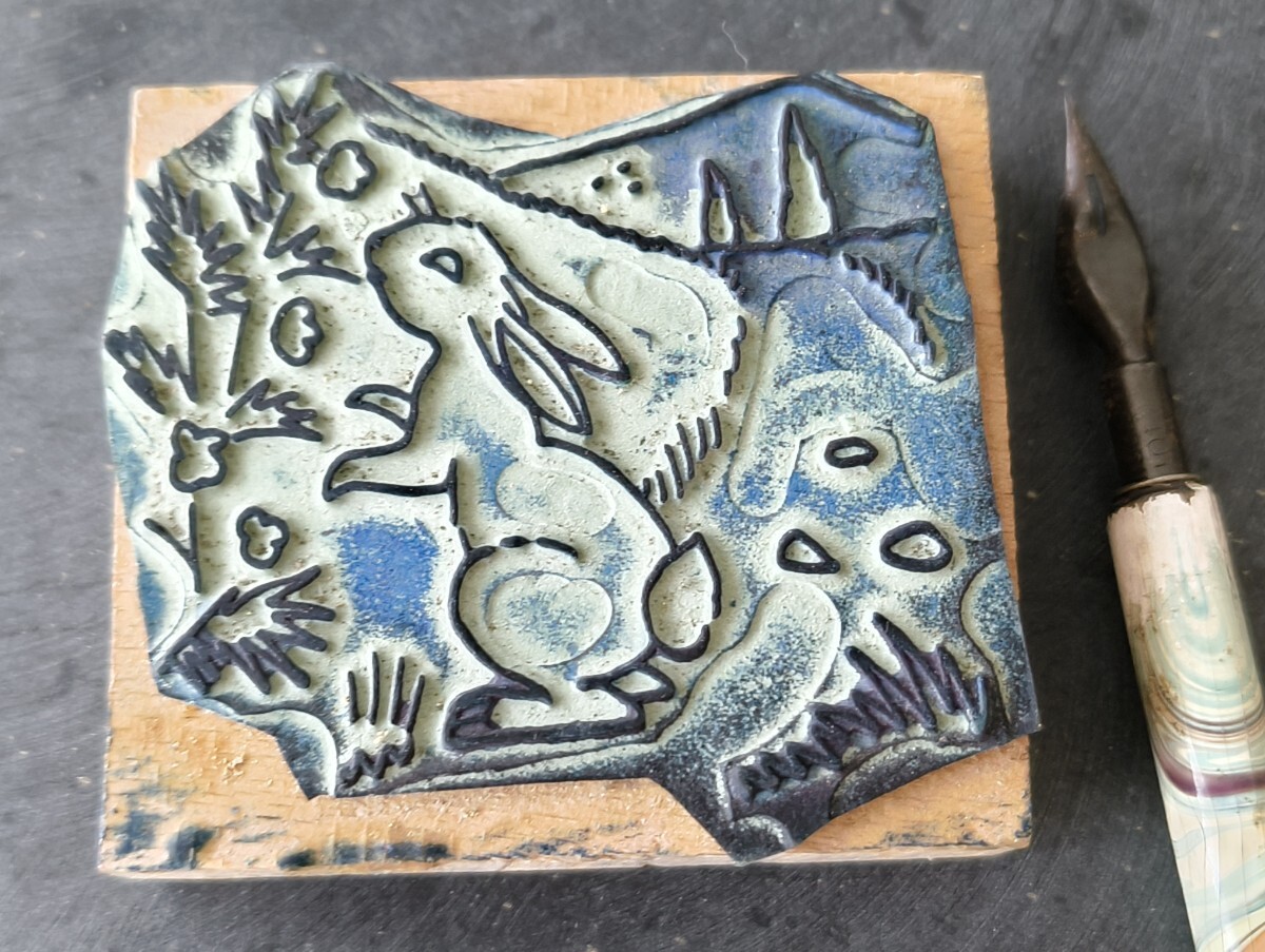 - 花の匂いを嗅ぐ兎 寄り道 野ウサギ 小動物 ペット フランス アンティーク 子供 スタンプ ヴィンテージ はんこ アニマル レトロ