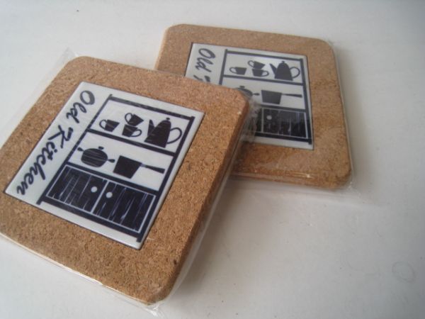 > 未使用品 コルク鍋敷き 角型 タイル付き 2枚 キッチン用品 15x15cm 調理器具 なべしき/23N7.18-48.1