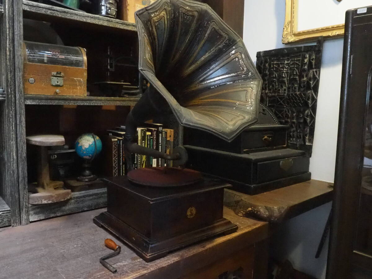 - 【ラッパ付き蓄音機】稼動品レコードプレーヤーSP盤ターンテーブル古道具アンティーク骨董インテリアインダストリアルハンドル