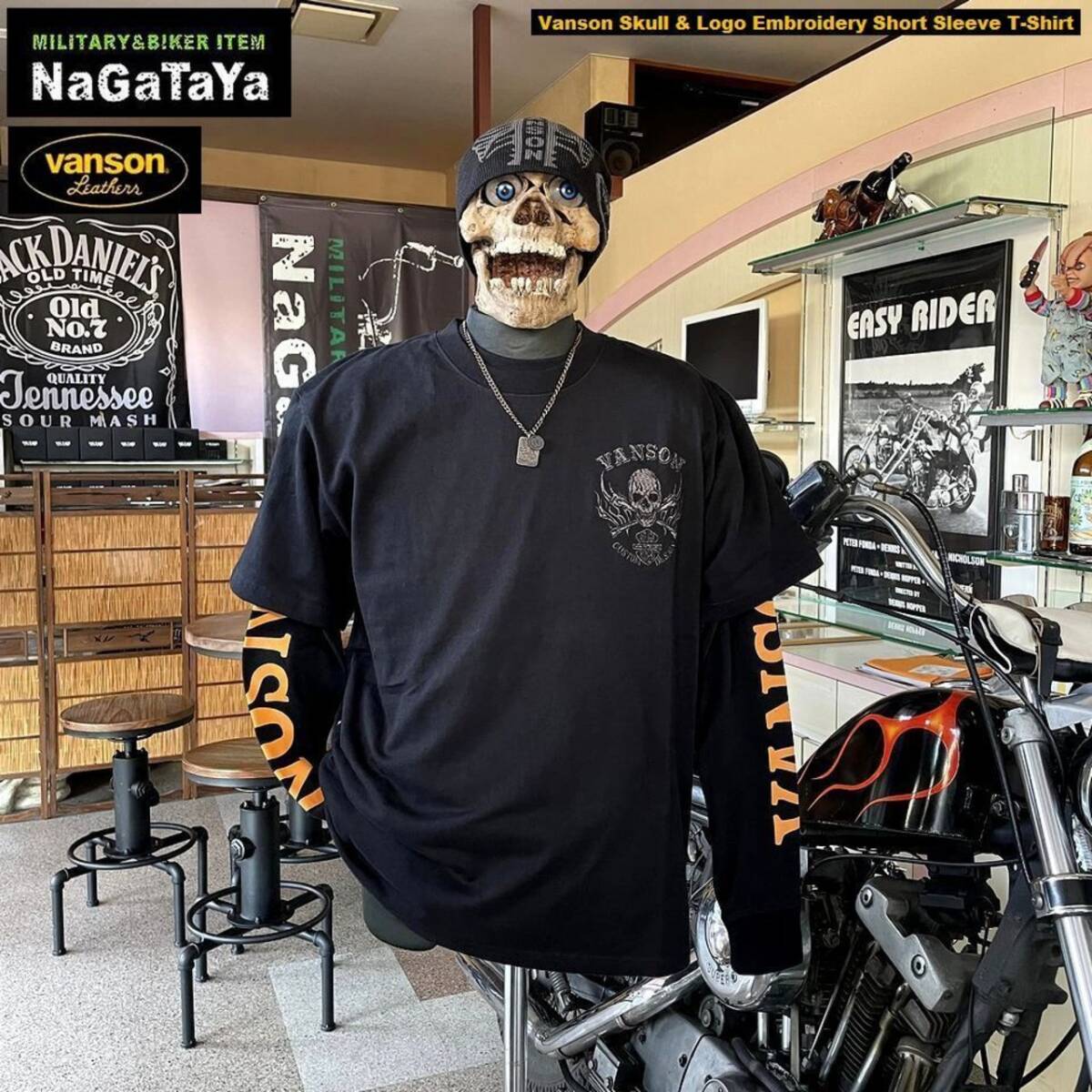 - VANSON バンソン NVST-2402 スカル&ロゴ刺繍 天竺 半袖Tシャツ ブラック×シルバーグレー Mサイズ バイカーウェア