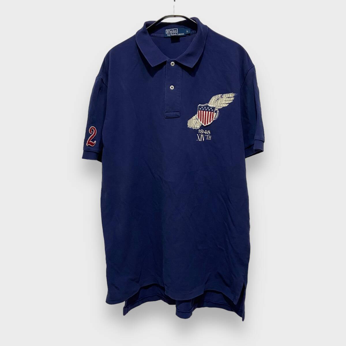 - 送料無料☆☆RalphLauren☆ラルフローレン☆半袖ポロシャツ☆ウィングフット☆星条旗☆ナンバリング☆ワンポイントロゴ☆ネイビー☆L☆H24M