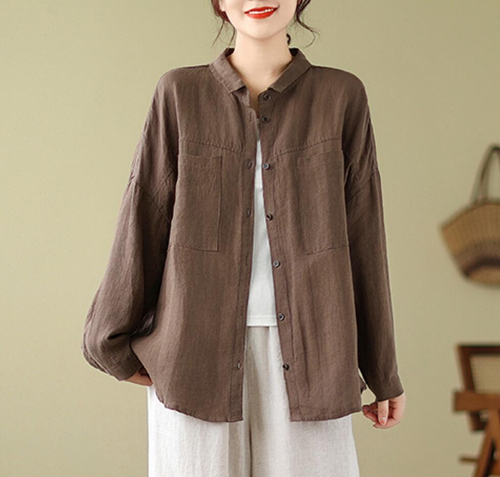 - 新入荷*秋新作 カジュアル ゆったり 無地 綿麻 シャツ 長袖 チュニック 着痩せ トップス 前開き シャツ 大きいサイズ ブラウス*コーヒー