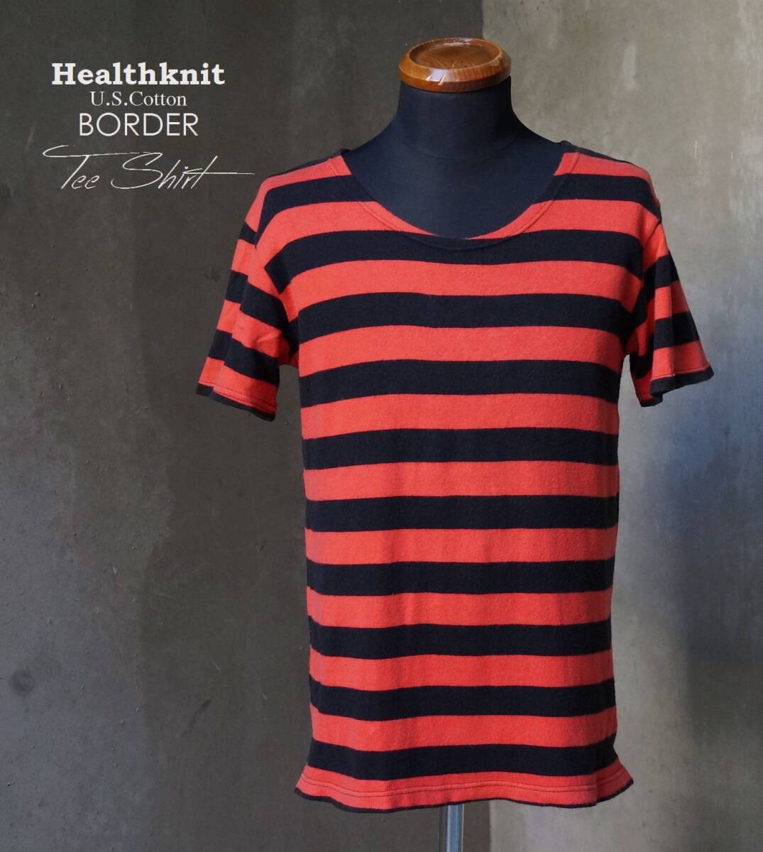 - ヘルスニット Healthknit コットン 赤黒 ボーダー 半袖 Tシャツ M