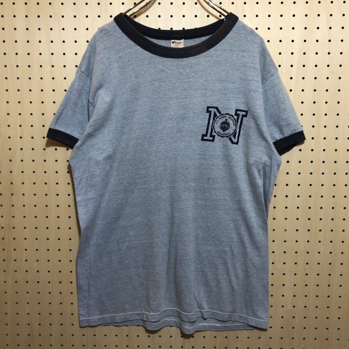 - 【L】80's Vintage Champion Cotton Trim Tee 80年代 チャンピオン リンガー カレッジ Tシャツ トリコタグ 霜降り 青杢 USA製 T632