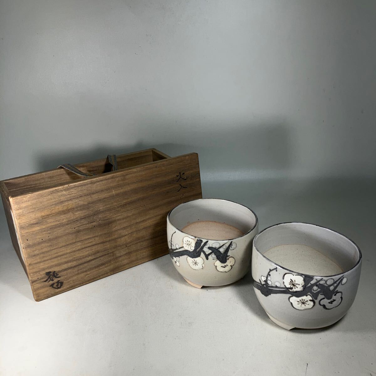 - 大野鈍阿造 火入 梅図 三つ足 赤白 2客 共箱