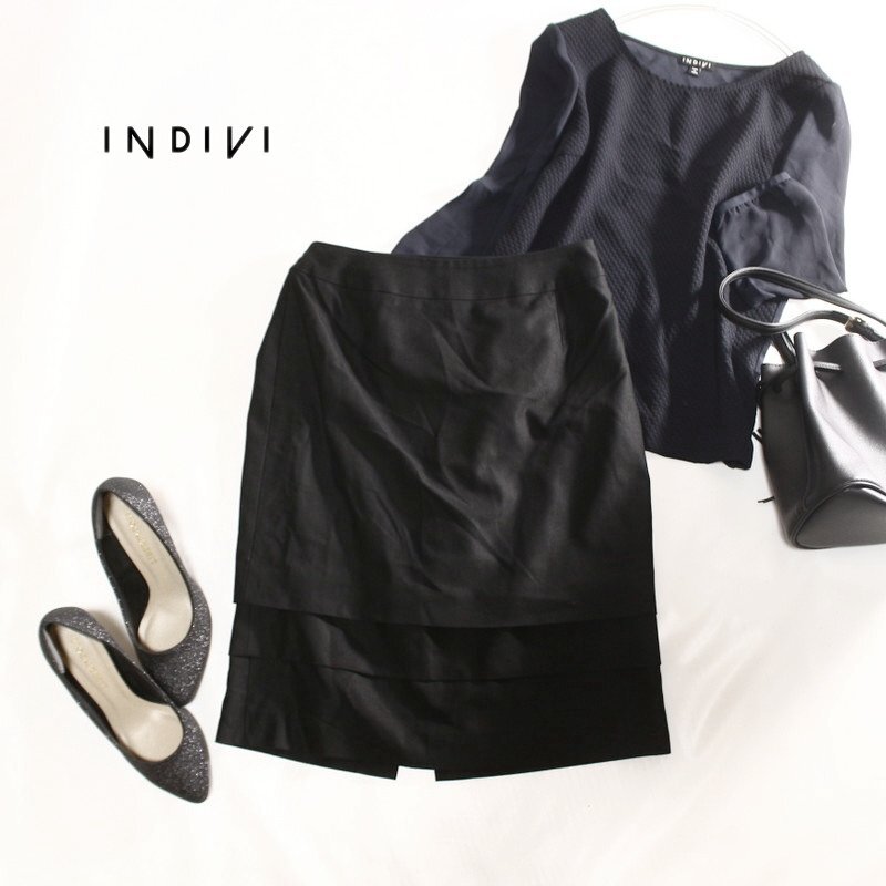 - インディヴィ INDIVI 株) ワールド 秋 冬 合物 上品 広がりの無い段フリル タイトスカート スーツ 9号 38 ブラック 黒 ビジネス フォーマル