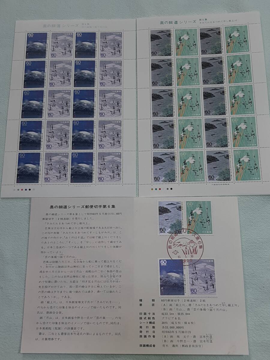 奥の細道シリーズ 第6集 五月雨を集めて林最上川・雲の峰いくつ法手が津野山 1988 切手シート各1枚と初日印切手付き解説書